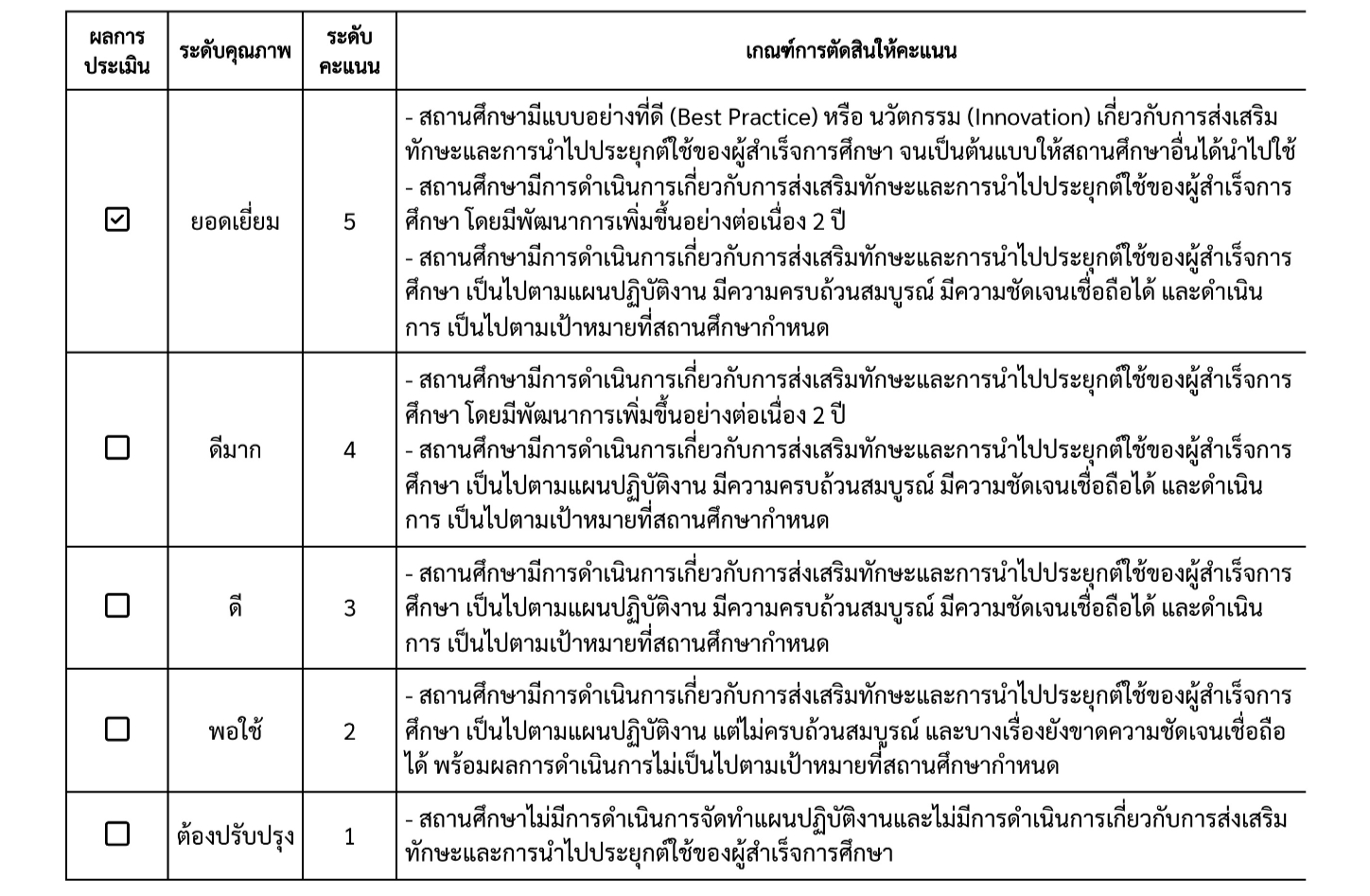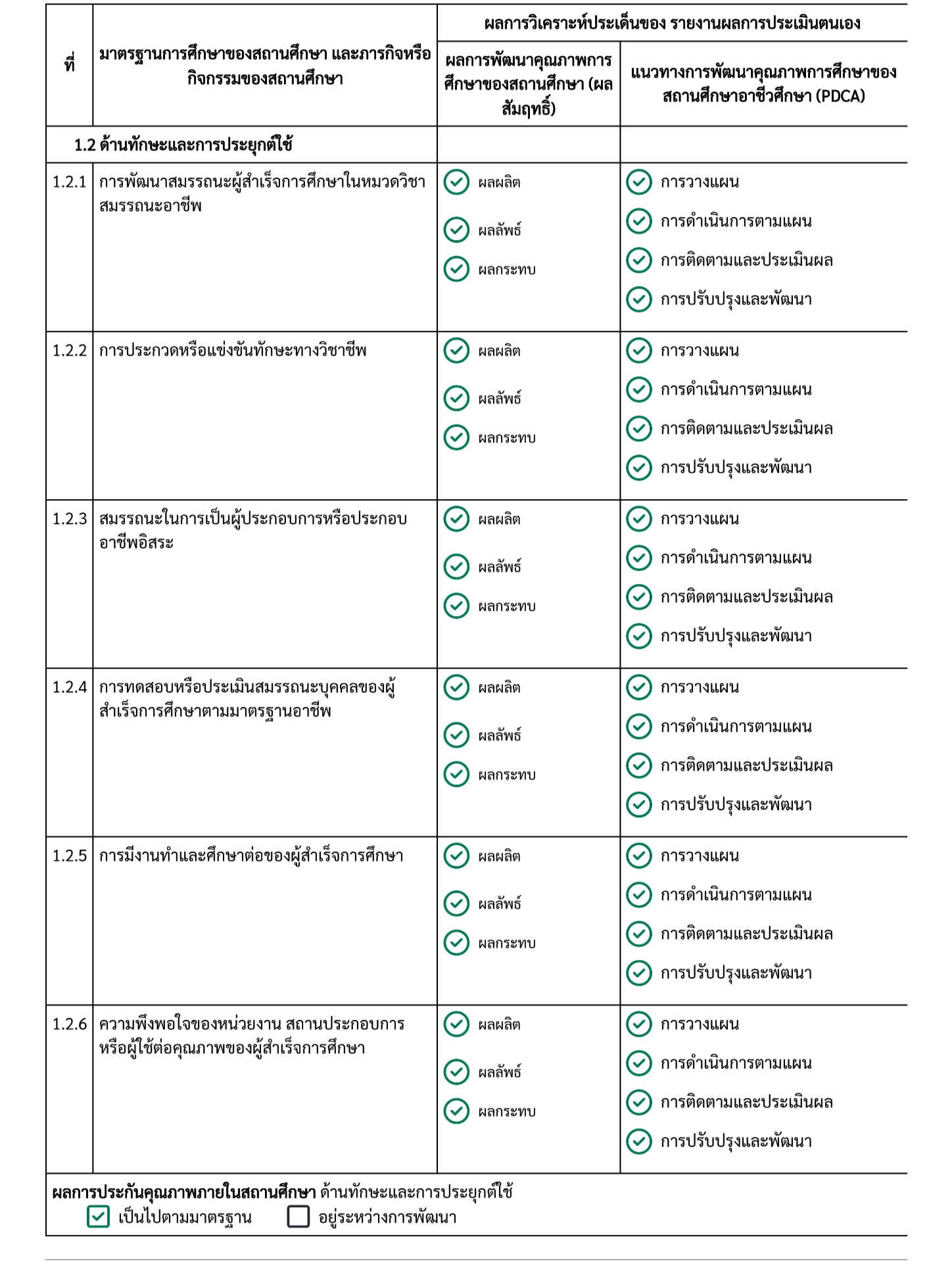 จากการประเมิน ติดตาม และตรวจสอบคุณภาพการศึกษาตามเกณฑ์การประเมินคุณภาพการศึกษาของสถานศึกษา ปรากฏผลการประเมินคุณภาพการศึกษาในมาตรฐานที่ 1 คุณลักษณะของผู้สำเร็จการศึกษาอาชีวศึกษาที่พึงประสงค์ ด้านทักษะและการประยุกต์ใช้ อยู่ในระดับคุณภาพ ยอดเยี่ยม ที่ระดับคะแนน 5