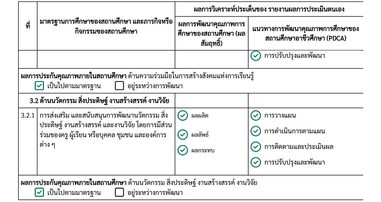 จากการประเมิน ติดตาม และตรวจสอบคุณภาพการศึกษาตามเกณฑ์การประเมินคุณภาพการศึกษาของสถานศึกษา ปรากฏผลการประเมินคุณภาพการศึกษาในมาตรฐานที่ 3 การสร้างสังคมแห่งการเรียนรู้ ด้านนวัตกรรม สิ่งประดิษฐ์ งานสร้างสรรค์ งานวิจัย อยู่ในระดับคุณภาพ ดีมาก ที่ระดับคะแนน 4