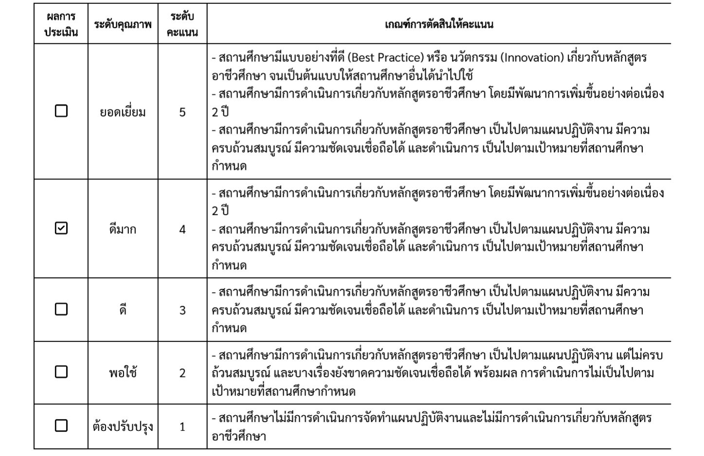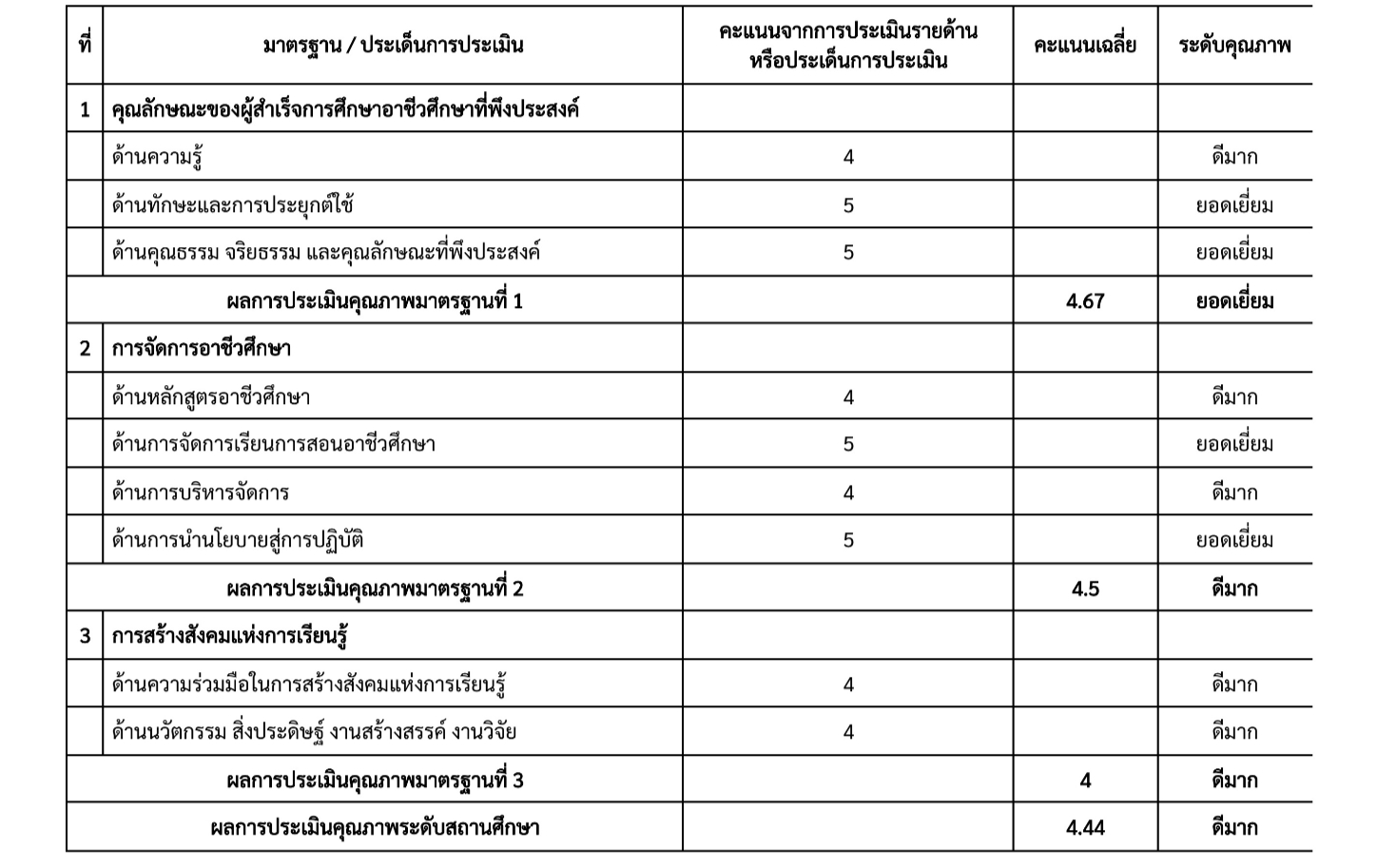จากการประเมิน ติดตาม และตรวจสอบคุณภาพการศึกษาตามเกณฑ์การประเมินคุณภาพการศึกษาของสถานศึกษา ปรากฏผลการประเมินคุณภาพการศึกษาในมาตรฐานที่ 2 การจัดการอาชีวศึกษา ด้านหลักสูตรอาชีวศึกษา อยู่ในระดับคุณภาพ ดีมาก ที่ระดับคะแนน 4