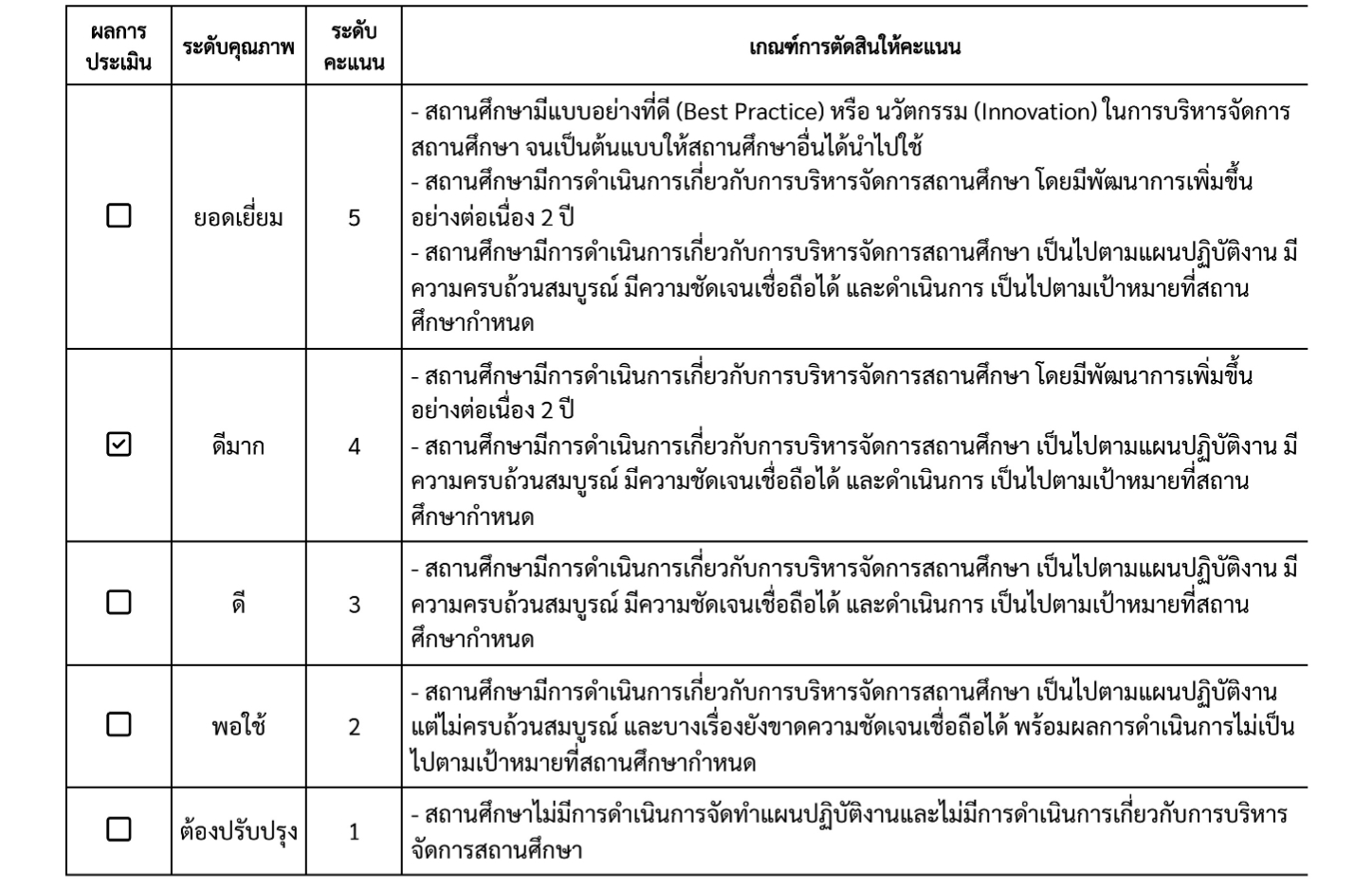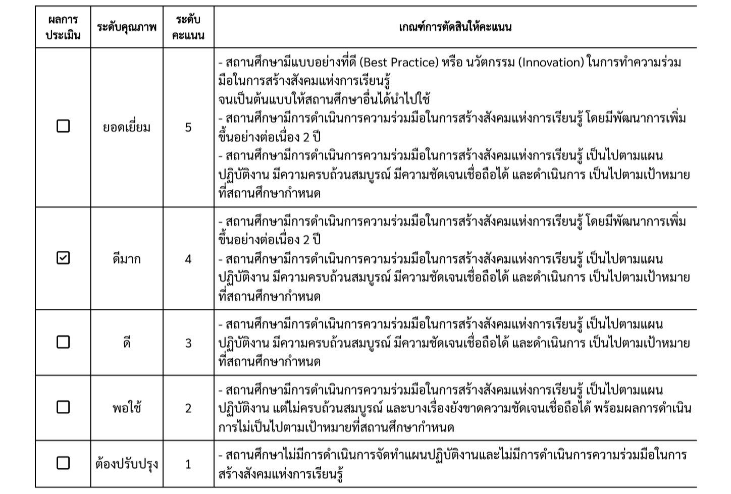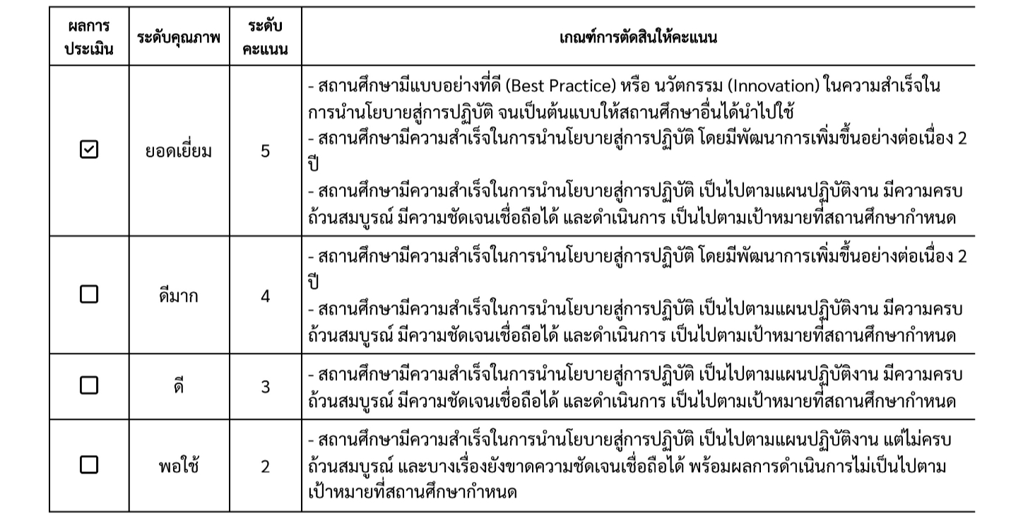 โดยในการดำเนินการประเมิน สถานศึกษาสามารถบันทึกผลการประเมินระดับมาตรฐาน ได้ดังนี้
