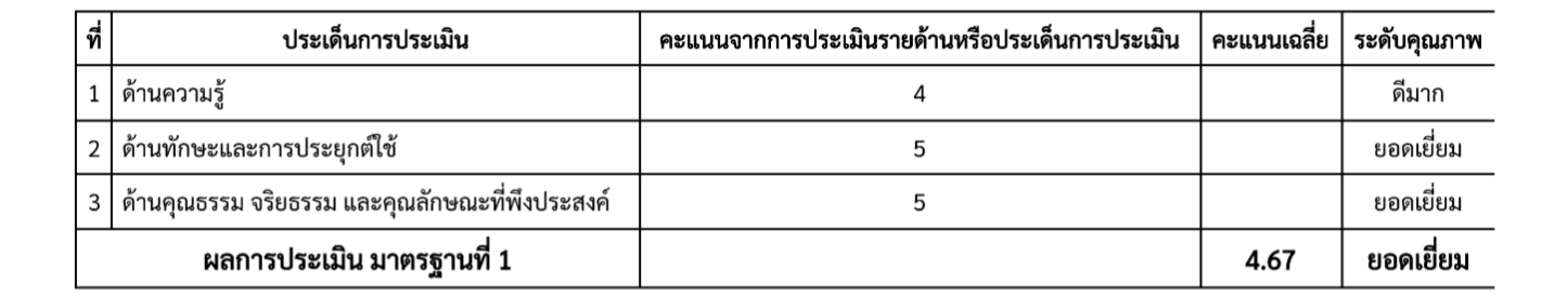 จากการประเมิน ติดตาม และตรวจสอบคุณภาพการศึกษาตามเกณฑ์การประเมินคุณภาพการศึกษาของสถานศึกษา ปรากฏผลการประเมินคุณภาพการศึกษาในมาตรฐานที่ 1 คุณลักษณะของผู้สำเร็จการศึกษาอาชีวศึกษาที่พึงประสงค์ ด้านคุณธรรม จริยธรรม และคุณลักษณะที่พึงประสงค์ อยู่ในระดับคุณภาพ ยอดเยี่ยม ที่ระดับคะแนน 5