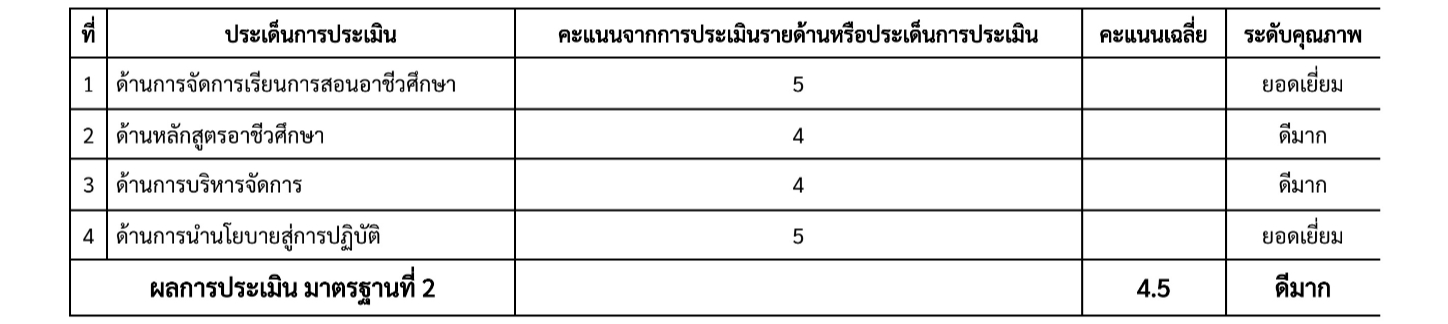 จากการประเมิน ติดตาม และตรวจสอบคุณภาพการศึกษาตามเกณฑ์การประเมินคุณภาพการศึกษาของสถานศึกษา ปรากฏผลการประเมินคุณภาพการศึกษาในมาตรฐานที่ 2 การจัดการอาชีวศึกษา ด้านการนำนโยบายสู่การปฏิบัติ อยู่ในระดับคุณภาพ ยอดเยี่ยม ที่ระดับคะแนน 5