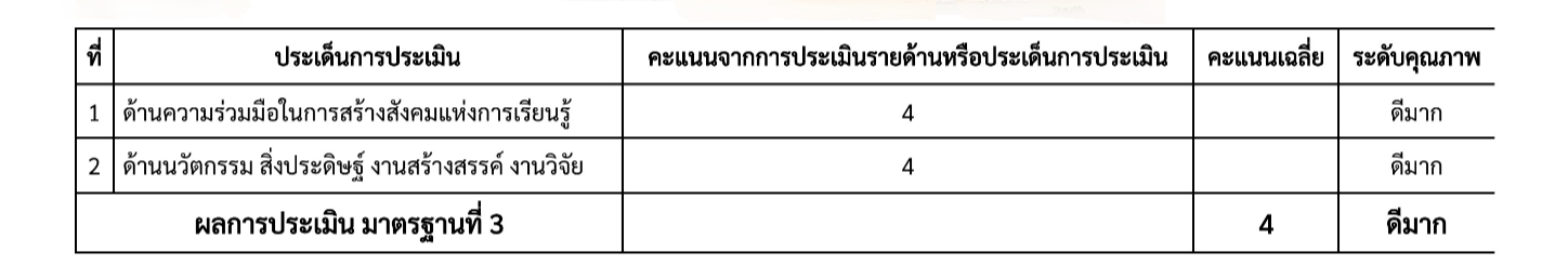 จากการประเมิน ติดตาม และตรวจสอบคุณภาพการศึกษาตามเกณฑ์การประเมินคุณภาพการศึกษาของสถานศึกษา ปรากฏผลการประเมินคุณภาพการศึกษาในมาตรฐานที่ 3 การสร้างสังคมแห่งการเรียนรู้ ด้านความร่วมมือในการสร้างสังคมแห่งการเรียนรู้ อยู่ในระดับคุณภาพ ดีมาก ที่ระดับคะแนน 4