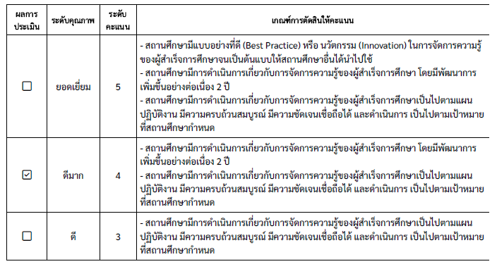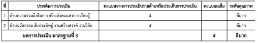 สรุป ผลการประเมินคุณภาพมาตรฐานที่ 3 การสร้างสังคมแห่งการเรียนรู้ ตามเกณฑ์การประเมิน พบว่า การสร้างสังคมแห่งการเรียนรู้ อยู่ในระดับคุณภาพ ดีมาก ที่ระดับคะแนน 4