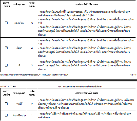 สรุป ผลการประเมินคุณภาพมาตรฐานที่ 2 การจัดการอาชีวศึกษา ประเด็นการประเมินที่ 2.3 ด้านการบริหารจัดการ ตามเกณฑ์การประเมิน พบว่า คุณลักษณะของผู้สำเร็จการศึกษาอาชีวศึกษาที่พึงประสงค์ ด้านการบริหารจัดการ อยู่ในระดับคุณภาพ ดีมาก ที่ระดับคะแนน 4