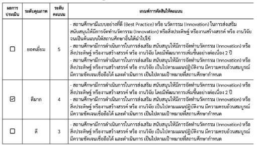 6. ผลการประเมินคุณภาพมาตรฐานที่ 3 การสร้างสังคมแห่งการเรียนรู้ ประเด็นการประเมินที่ 3.2 ด้านนวัตกรรม สิ่งประดิษฐ์ งานสร้างสรรค์ งานวิจัย